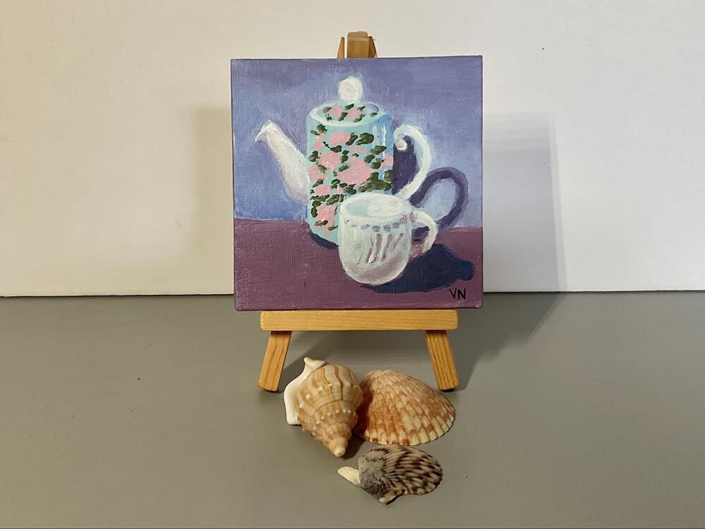 I can only imagine how delicious coffee would be served from such a delightful pot. This is another painting in the #mugsandmore painting challenge on Instagram. Photo by Debbie Rose Miller. This tiny painting comes with its own easel for shelf display. Painting and easel will be carefully packaged and sent with tracking.