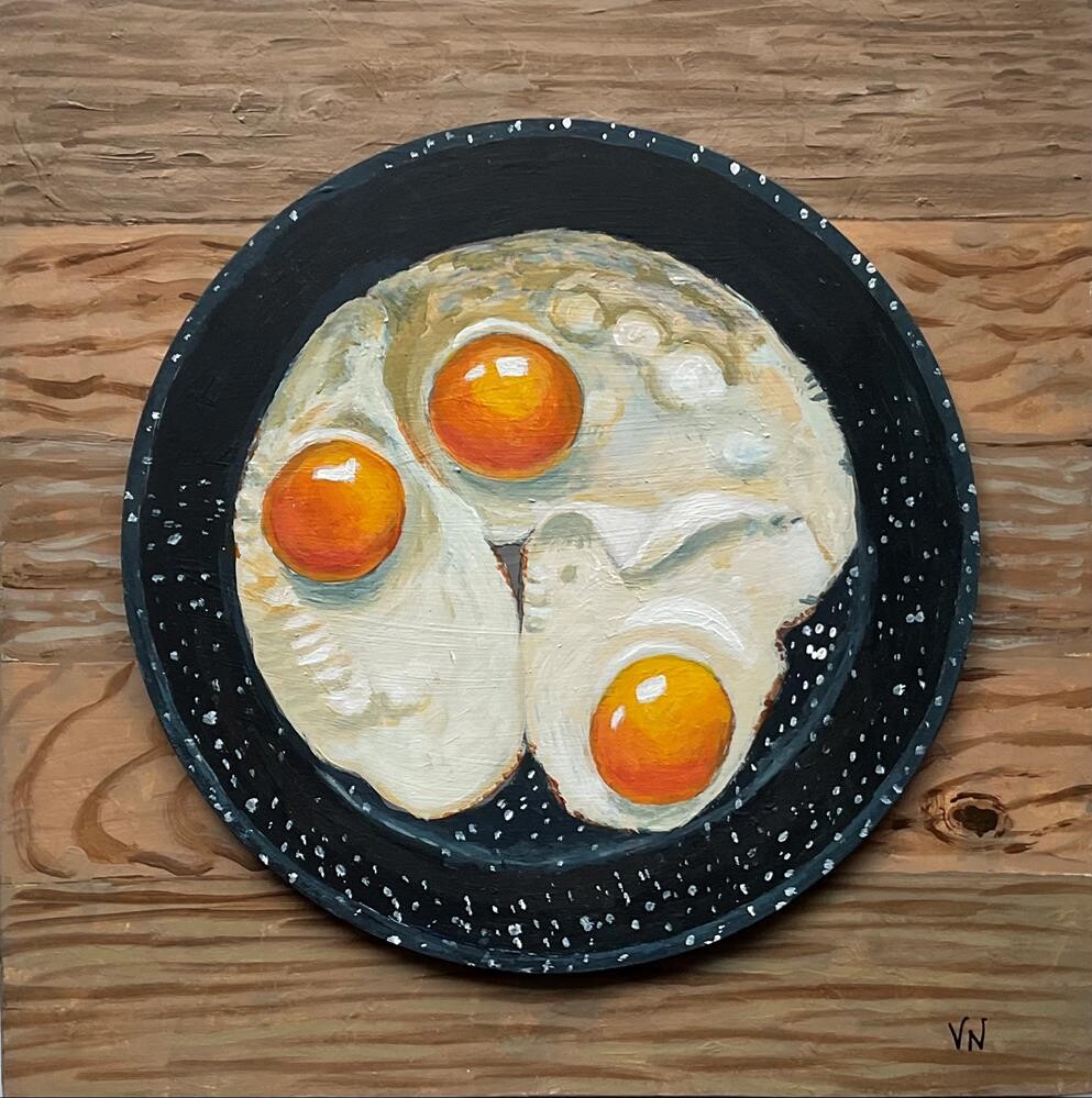 This painting of eggs in a pan was painted on a round panel which has been mounted on a 10x10x.75 inch wood panel. This painting of eggs in a pan was painted on a round panel which has been mounted on a 10x10x.75 inch wood panel. |