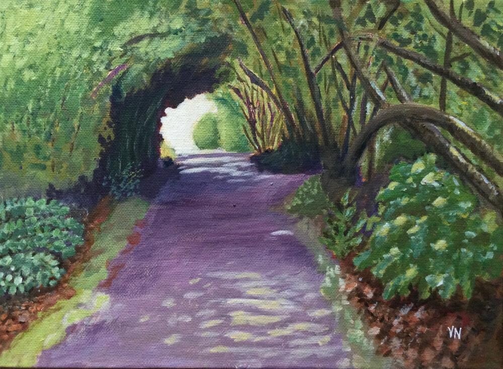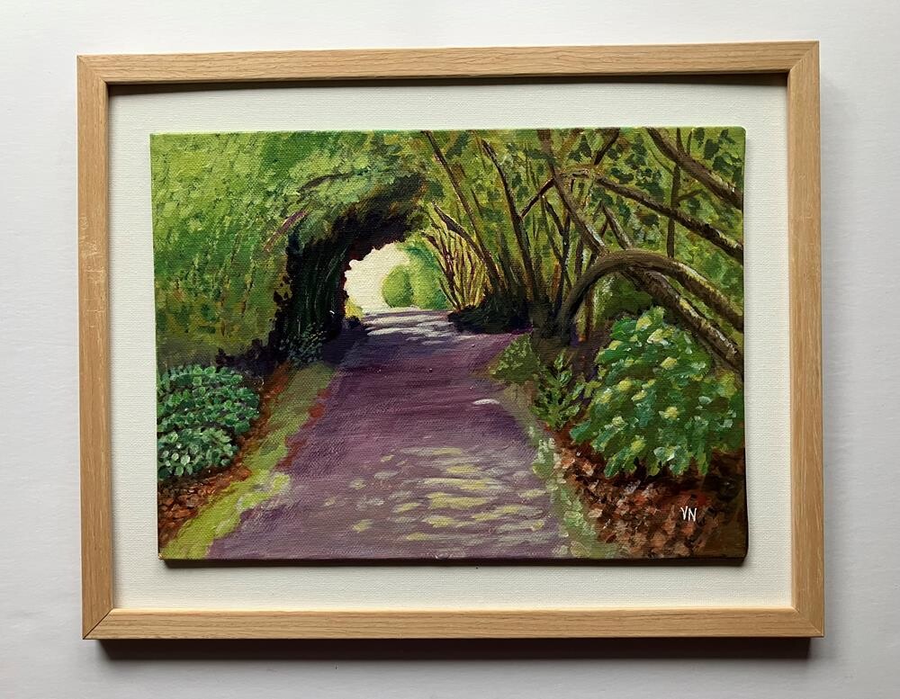 An easy local walking trail was a godsend during my recovery from a fractured shoulder in the spring of 2023. My right arm was in a sling for weeks. The light at the end of the tunnel on a section of the path was a beacon of hope as I chafed under my restricted abilities. (I did this painting with my arm in that sling: Where there’s a will, there’s a way!) I’m so grateful for the way God has created our bodies to heal. I’m now back to using both arms, but still working on regaining full range of motion. This painting is varnished with a satin finish. The 9x12 inch painted panel is mounted on an 11x14 inch white canvas panel which serves as a mat. They are sold as a unit. Your unframed painting + mat will be carefully packaged and sent with tracking.