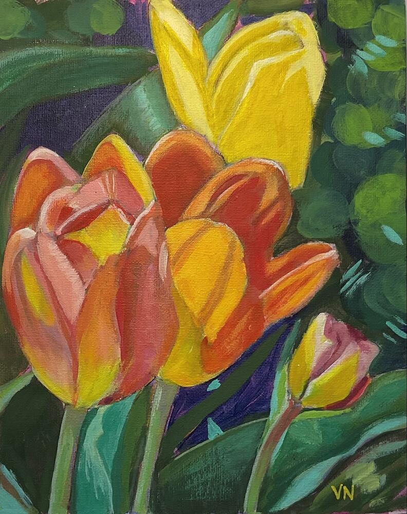 Who can resist painting tulips in the spring? Not I! These were inspired by the colourful plantings in our city boulevards. What a shame that they fade so quickly. Your unframed painting is protected with acrylic varnish. Its standard size means it fits a standard 8x10 inch frame – no glass needed. It will be carefully packaged and sent with tracking.
