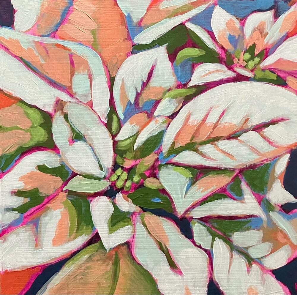 A holiday poinsettia that will never drop its leaves or need watering. (Painted with Ali Kay.) Painted on a 10 x 10 x 1.5 inch panel. The 1.5 inch edges are painted creamy white to match the white of the flower. The painting and edges are varnished and a hanging wire is installed on the back. Your painting will be carefully packaged and sent with tracking. A holiday poinsettia that will never drop its leaves or need watering. (Painted with Ali Kay.) Painted on a 10 x 10 x 1.5 inch panel. The 1.5 inch edges are painted creamy white to match the white of the flower. The painting and edges are varnished and a hanging wire is installed on the back. Your painting will be carefully packaged and sent with tracking. |