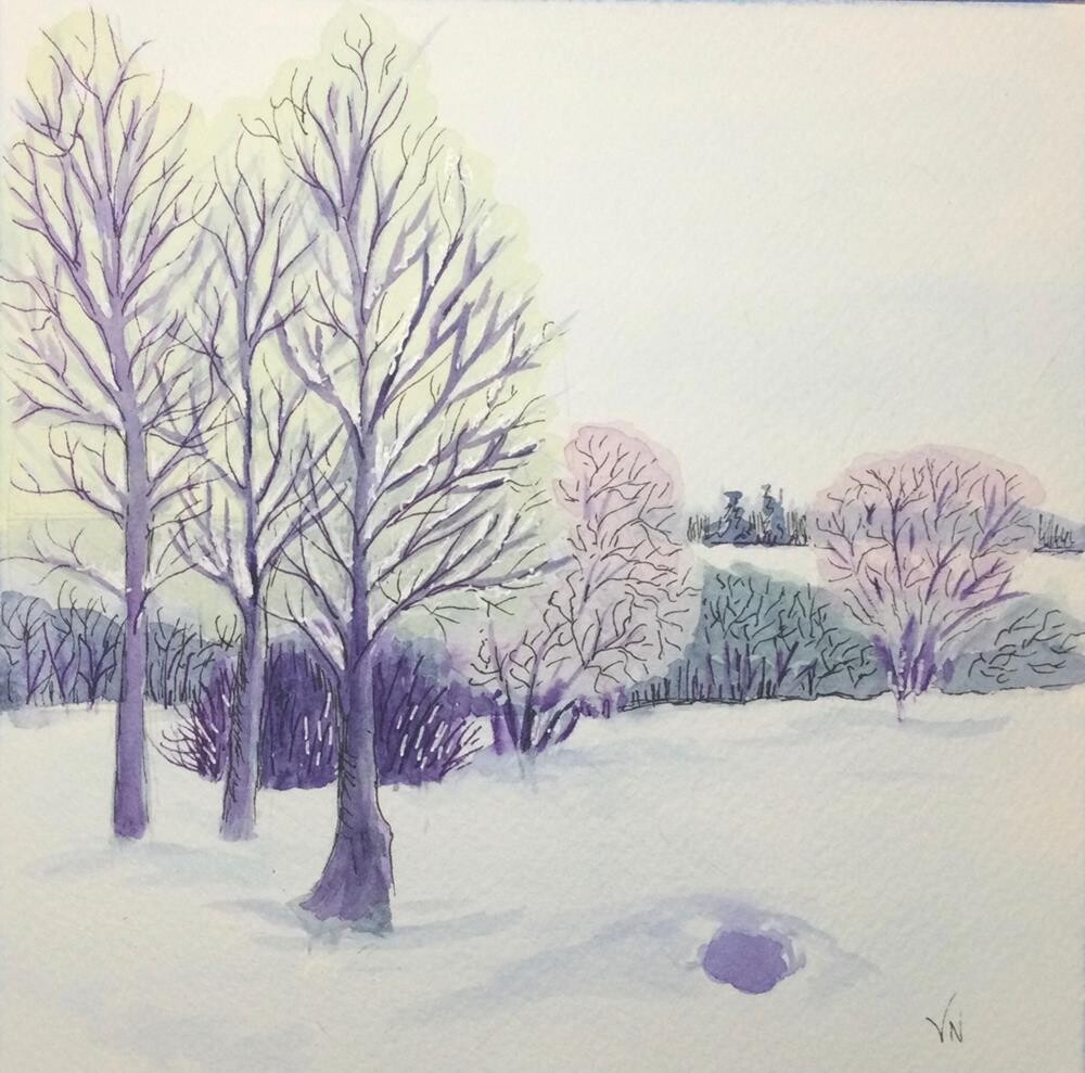 Even in a seeminly monochromatic winter scene, one can detect pastel shades. I tried to capture the subtle colours I found in the reference photograph of a winter scene in Saskatchewn, generously provided by Trudy Olfert. This watercolor with pen painting is unframed. It will be carefully packaged and sent with tracking. Even in a seeminly monochromatic winter scene, one can detect pastel shades. I tried to capture the subtle colours I found in the reference photograph of a winter scene in Saskatchewn, generously provided by Trudy Olfert. This watercolor with pen painting is unframed. It will be carefully packaged and sent with tracking. |