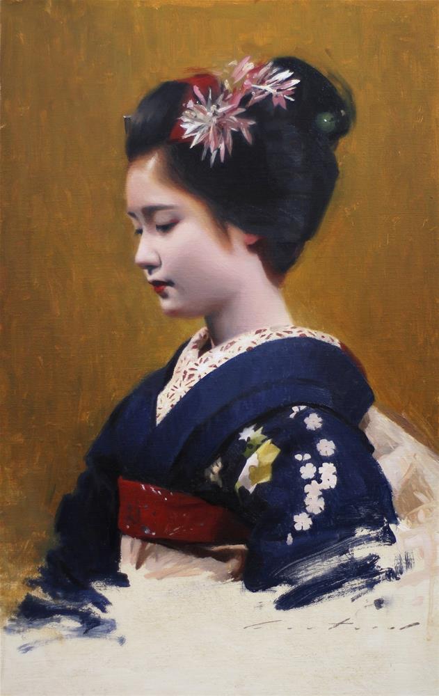 Portrait of Naoai- original oil painting on 45.5cm x 38cm canvas boardThis is an oil painting of Naoai, a maiko (apprentice geisha) from the Kamishichiken district of Kyoto, Japan.All of my artwork is original and signed, comes with a certificate of authenticity, and is securely shipped using Japan Post EMS with tracking.